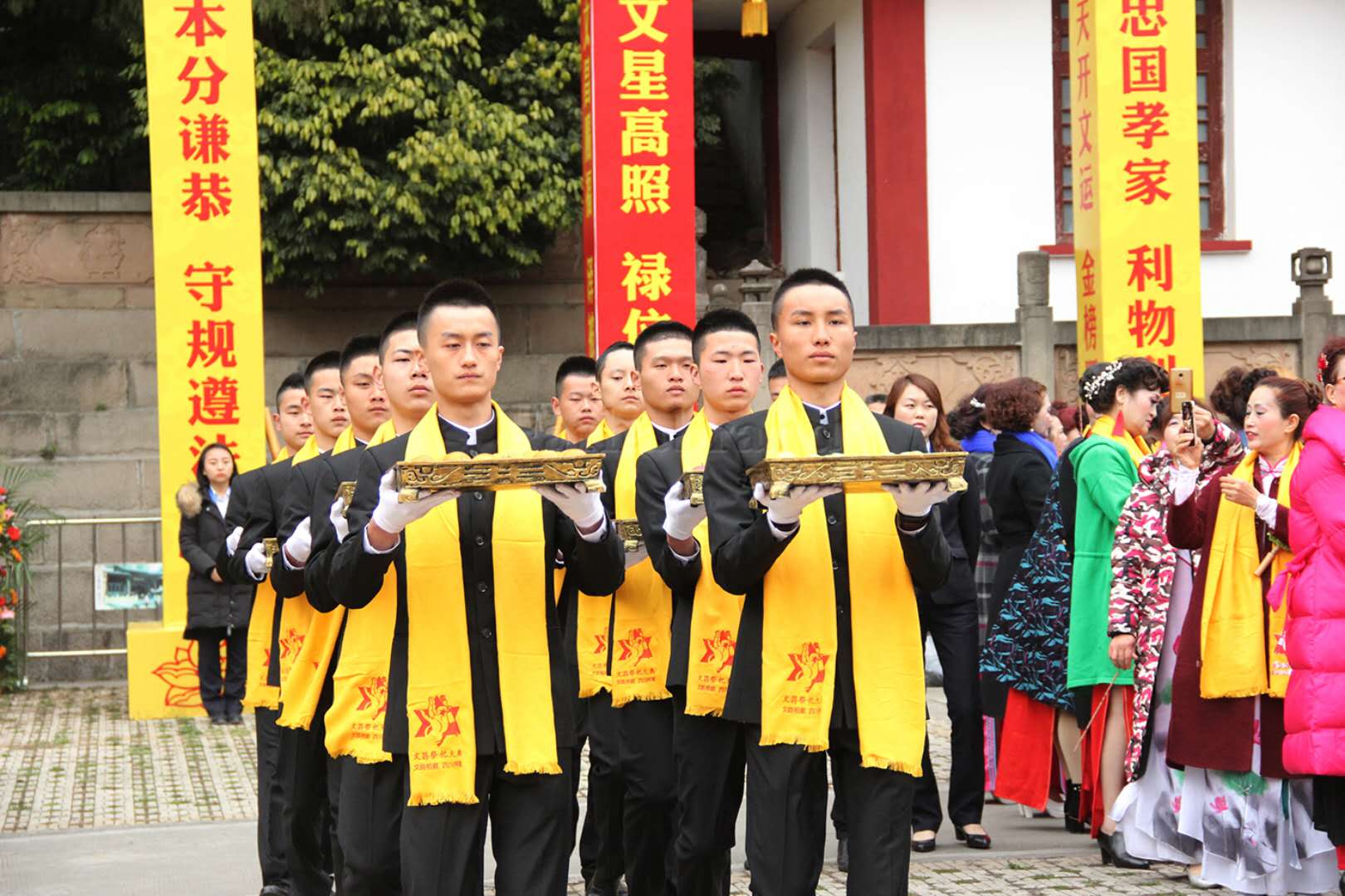 伴著歌舞,初獻禮開始。30名高校學(xué)子代表沿祭祀通道緩緩上前,向文昌帝君恭獻書卷,而后齊聲朗誦被譽為“善書三圣經(jīng)”之一的《文昌陰騭文》名句,“濟人之難,救人之急,憫人之孤,容人之過,廣行陰騭,上格蒼穹……”莘莘學(xué)子的誦讀,形象的傳播出文昌文化所倡導(dǎo)的扶危濟困、助人為樂的道德思想。